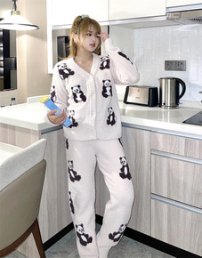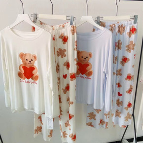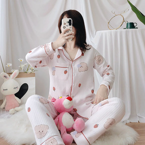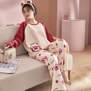 女士睡衣 秋冬季空气层棉质小熊长袖长裤套装 新款加...