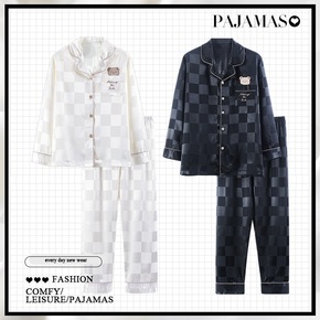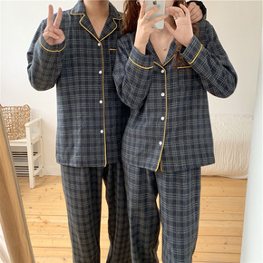 情侣款磨毛格子睡衣秋冬新品男女款长袖长裤开衫两件套...