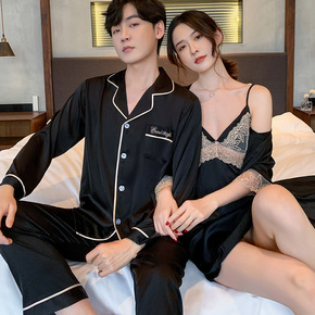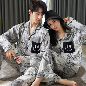 新款秋冬季睡衣女情侣套装男冰丝绸翻领开衫长袖长裤宽...