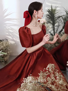 敬酒服新娘冬季法式轻奢晚礼服裙女酒红色缎面订婚大码...