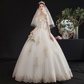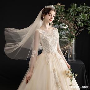 外贸2021春新款欧美女装亚马逊长袖一字肩新娘婚纱...