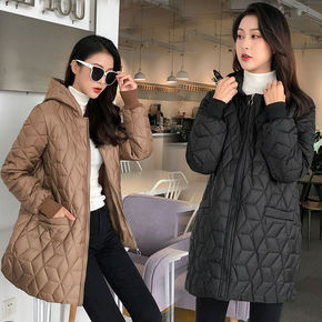 冬装新款大码显瘦格子连帽洋气休闲加厚棉衣女中长款棉...