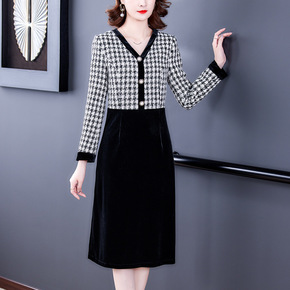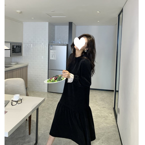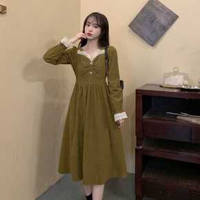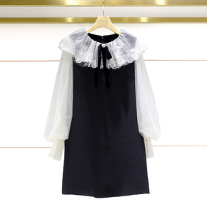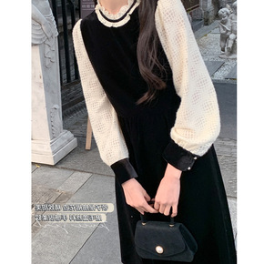 复古时髦简约走私浪漫 丝绒蕾丝拼接打底连衣裙女 2...