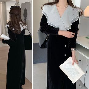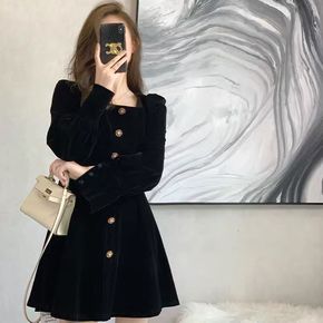 法式复古金丝绒连衣裙女秋冬赫本风小黑裙长袖收腰显瘦...