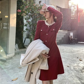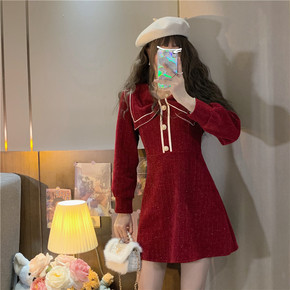 蝴蝶结领红色连衣裙女秋冬新款加厚新年圣诞短裙...