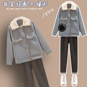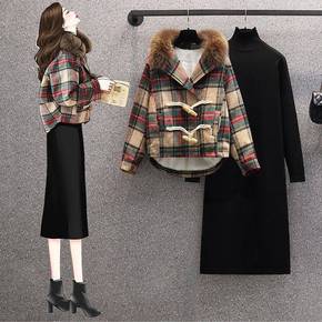 大码女装冬装胖妹妹mm轻熟风显瘦套装毛呢外套丝绒裙...
