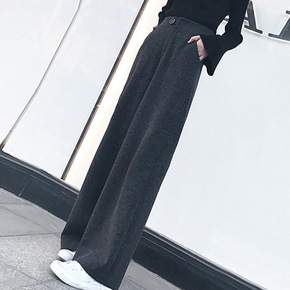 毛呢裤女秋冬复古高腰直筒阔腿烟管裤子宽松大码女装加...