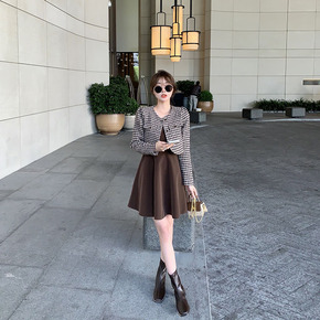 名媛小香风套装裙洋气千鸟格毛呢2021秋季冬装新款...