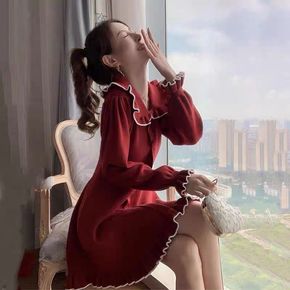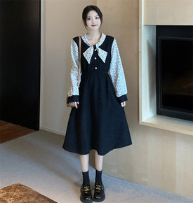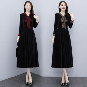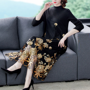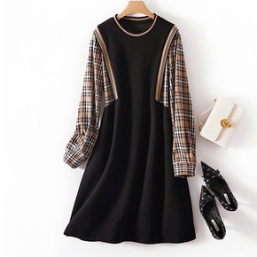 刺绣连衣裙女秋冬装2020新款韩版圆领拼接气质大码...