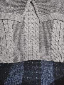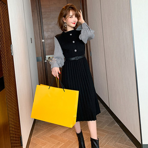 MIUCO针织拼接千鸟格收腰显瘦灯笼袖百褶连衣裙女...