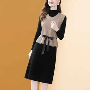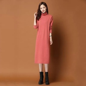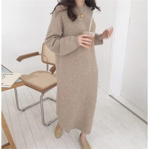 2022秋冬韩版高领纯色长款针织连衣裙厚网红宽松内...