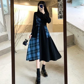 大码女装甜酷连衣裙秋冬松紧绑带收腰不规则蓝黑格子裙...