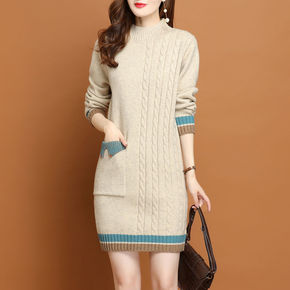 文艺风秋冬新款宽松半高领加厚毛衣裙女洋气中长款针织...