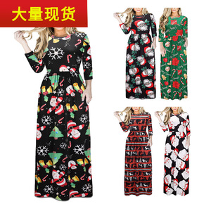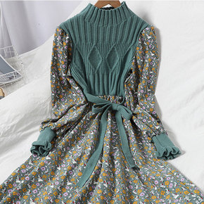 跨境电商欧美秋冬新款拼接蕾丝印花肥款连衣裙 一件代...