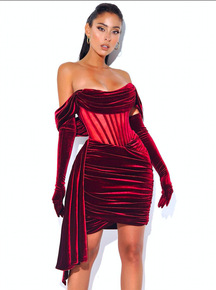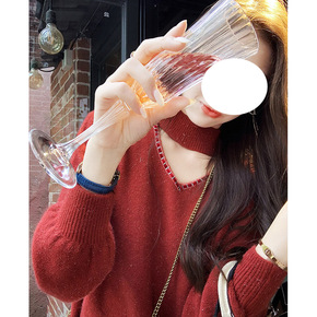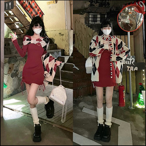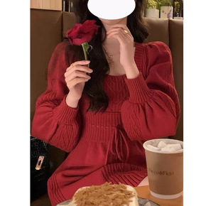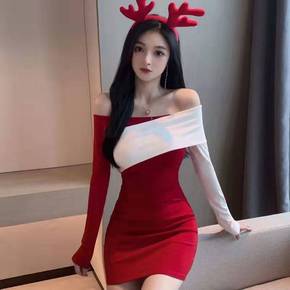 圣诞战袍 辣妹连衣裙秋冬针织修身包臀肩套红色新年圣...