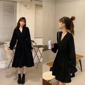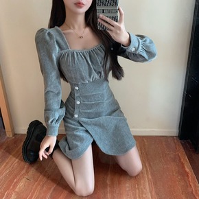 泡泡袖连衣裙2021新款秋冬复古灯芯绒心机褶皱修身...