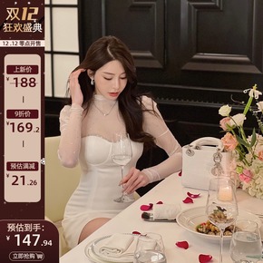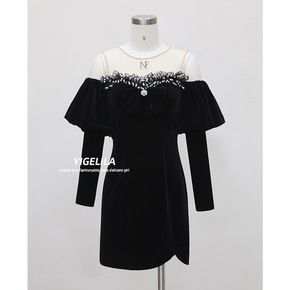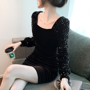 性感辣妹金丝绒亮片方领黑色包臀裙女新款秋冬季赫本风...