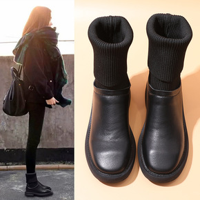马丁靴女2021秋冬加绒新品爆款毛线针织弹力瘦瘦女...