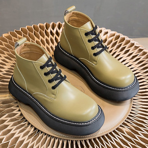 2021秋季新款内增高马丁靴女粉色系带百搭磨砂厚底...