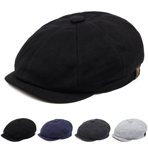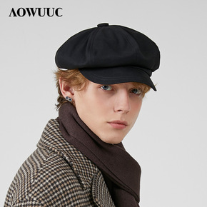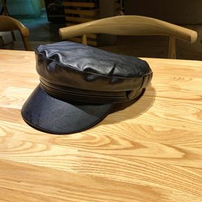 同款PU皮质海军帽女网红款复古贝雷平顶八角帽子女秋...