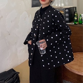 韩国冬季学院风可爱波点双口袋宽松夹棉加厚棉衣保暖棉...