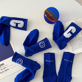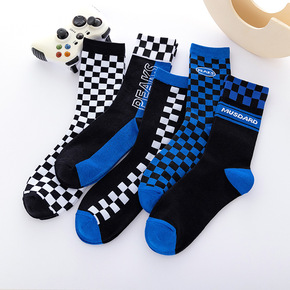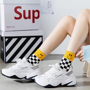袜子女 中筒棉袜子棋盘格长袜 ins潮笑脸高帮运...