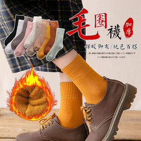 袜子女中筒冬季加绒加厚毛圈袜保暖地板袜女士纯色日系...
