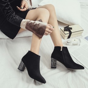 2019女新款欧美秋冬短靴单靴显瘦高跟绒面粗跟侧拉...