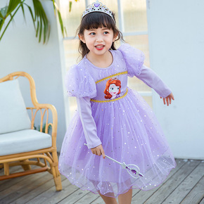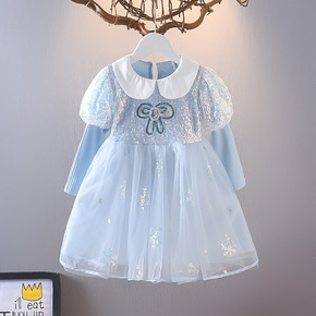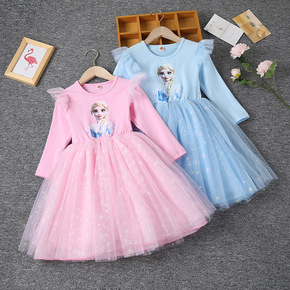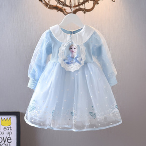 2021春秋新款女童装圆领网纱连衣裙冰雪奇缘泡泡袖...