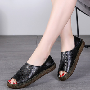 鱼嘴凉鞋女平底2020款夏季舒适真皮软底中老年妇女...
