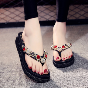网红凉拖鞋女夏时尚水钻百搭外穿人字拖中跟厚底防滑度...
