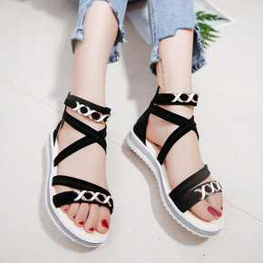 韩版平跟平底时尚舒适交叉高帮后拉链女凉鞋透气露趾学...