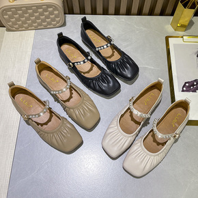 大码女鞋包头珍珠凉鞋女2022夏季新款方头褶皱一字...