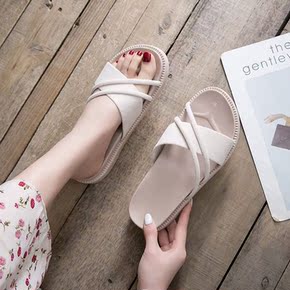 欧美新款圆头平底一字型拖鞋女亚马逊速卖通外贸大码金...
