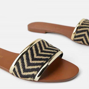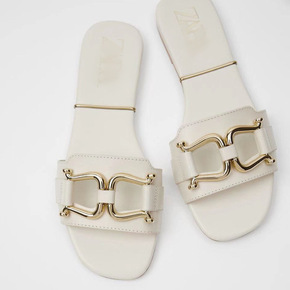 ZA新款女鞋裸色皮革效果金色搭扣时尚平底凉鞋拖鞋女...