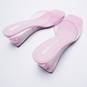 ZAR*新款玫红色透明坡跟迷你凉鞋2021夏方头仙...