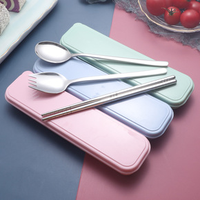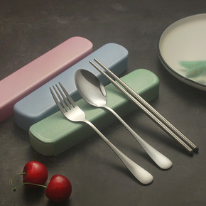 小麦盒 304不锈钢勺叉 便携式学生餐具套装可爱筷...