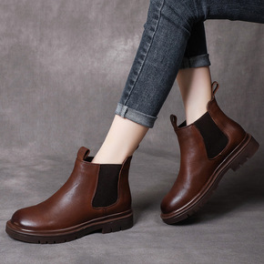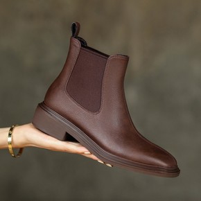 后拉链全皮切尔西靴2021冬新款软面牛皮红棕色复古...
