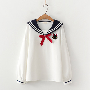 初中生高中生秋装新款刺绣猫头海军领毛圈棉套头长袖卫...