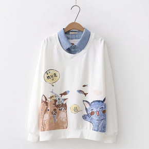 初中生高中生甜美学院风系带牛仔领拼接下摆猫印花长袖...