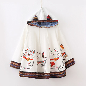 初中生高中生秋季新款森女猫印花连帽卫衣女斗篷披肩上...