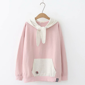 初中生高中生秋装新款日系学院风兔耳朵连帽领结长袖卫...