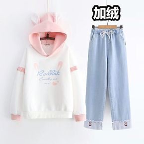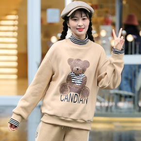 甜美加绒加厚少女卫衣套装初中生冬装女秋冬两件套高中...