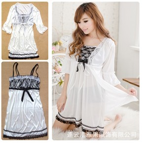 新款诱惑仿真丝情趣内衣外套 白色吊带性感睡衣2件套...