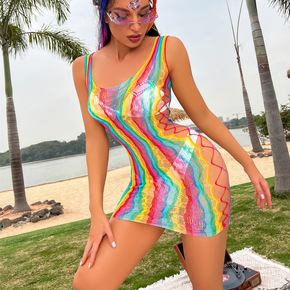 欧美免脱大码网红七彩色条纹情趣内衣夏沙滩比基尼外套...