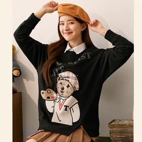 2021秋冬新款女装卡通刺绣毛圈棉宽松圆领小熊卫衣...