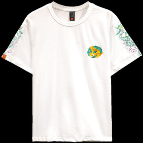 夏季国潮中国风男青年龙纹刺绣圆领短袖纯棉t恤 大码...