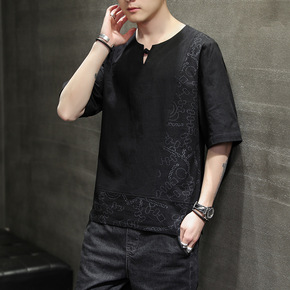风t恤男潮流拼接古风v领上衣潮流百搭男士宽松五分袖...