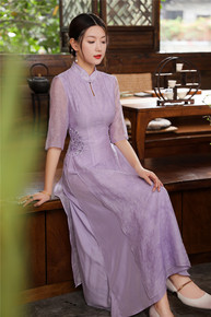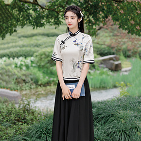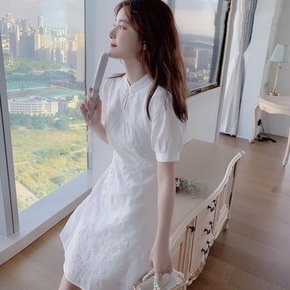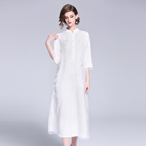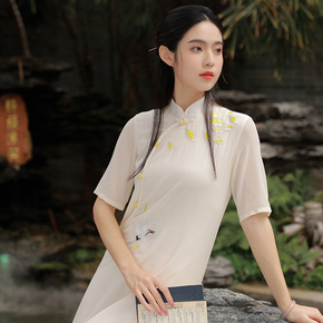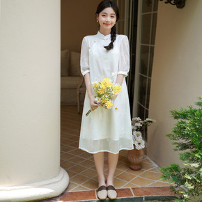 白绣花改良旗袍裙复古文艺新中式国风日常五分中袖宽松...