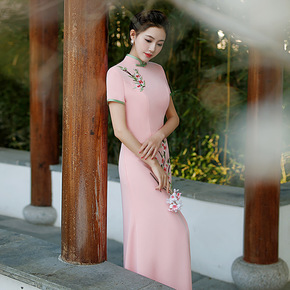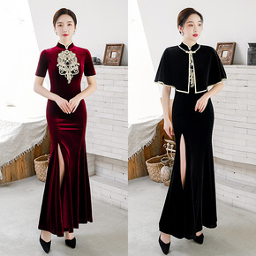 改良旗袍连衣裙2020新款丝绒刺绣长款修身旗袍搭配...